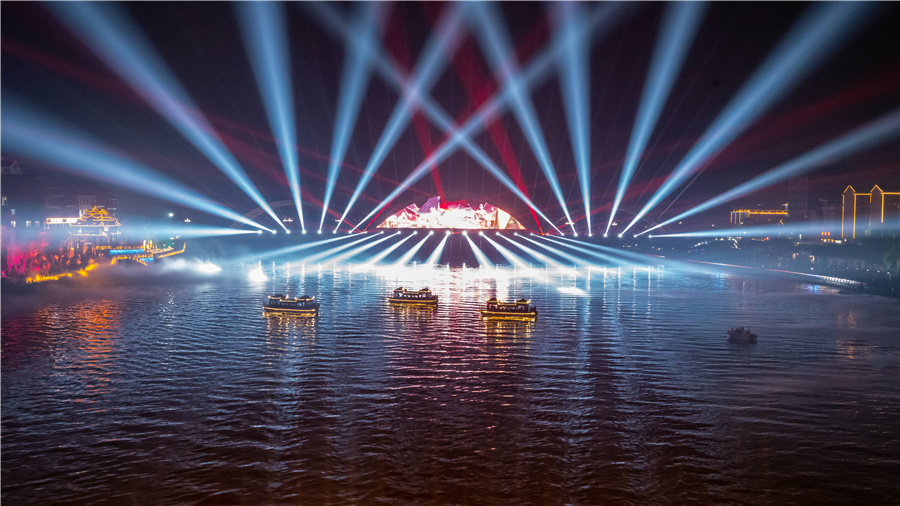 暮色四合,芷江和平湖上船影搖曳。兩岸燈火如星子傾落,水幕彩橋、巨幅光影、影像長廊次第綻放,龍津風雨橋、天后宮、萬和鼓樓、索子街吊腳樓群等建筑仿佛披上流光霓裳,在夜色中煥發(fā)別樣神采。