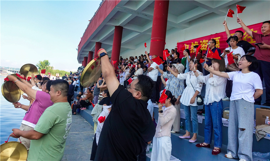 9月28日,2025年麻陽干部職工龍舟大賽在縣城錦江河段鳴鑼開賽,56支隊伍參與比賽,賽期3天。本次賽事項目為男女混合22人標準龍舟300米直道競速。(陳剛 攝)